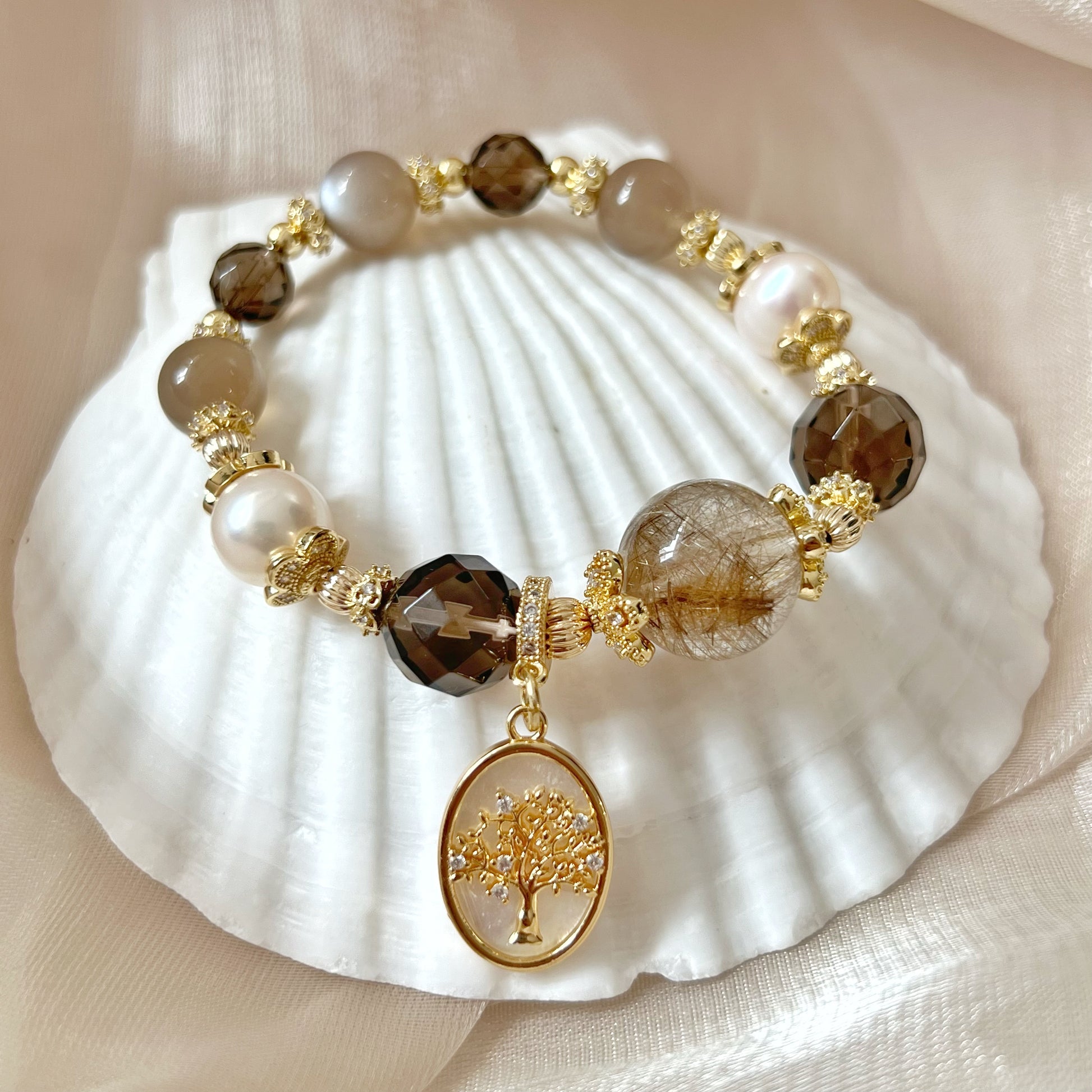 Silver Smoky Quartz – Grounds and purifies, protects against negative energies, and enhances intuition. Mocha Moonstone – Supports intuition, emotional balance, and feminine energy, guiding you with calm and insight. Smoky Quartz – Grounds, cleanses, and shields from negativity, promoting stability and clarity. Additional Information -