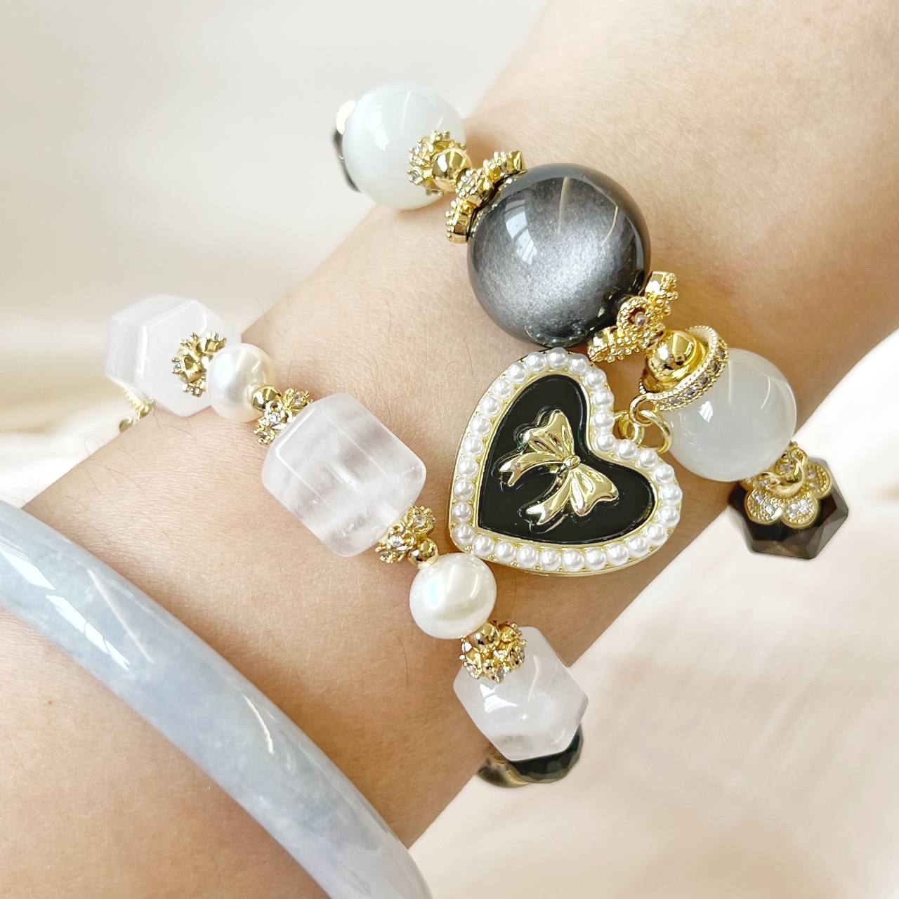 Crystals: Silver Sheen Obsidian, White Sheen Moonstone, Smoky Quartz, Freshwater Pearls