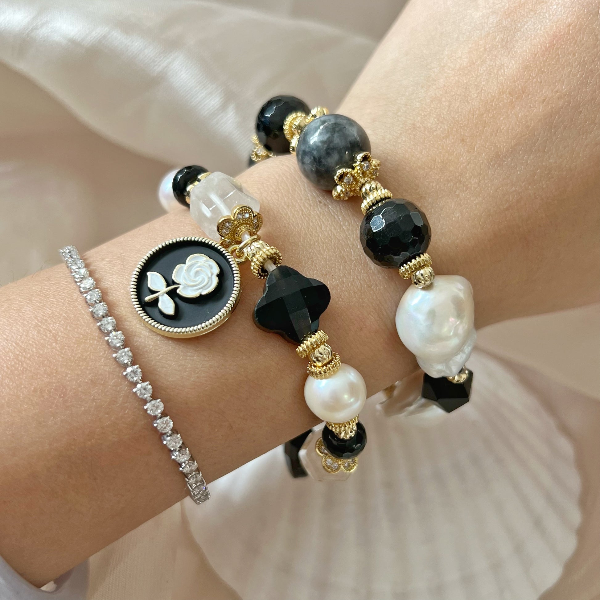 The Chic Bracelet is an elegant blend of White Phantom Quartz and Obsidian, uniting ethereal clarity with grounding strength. This combination balances light and shadow, guiding the wearer through spiritual awakening while providing protection and stability in everyday life.