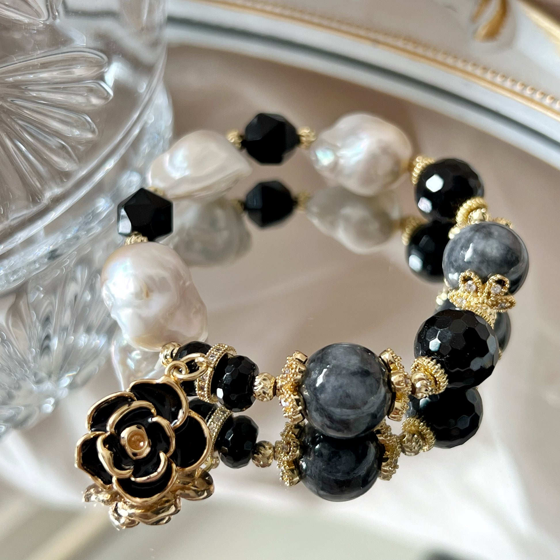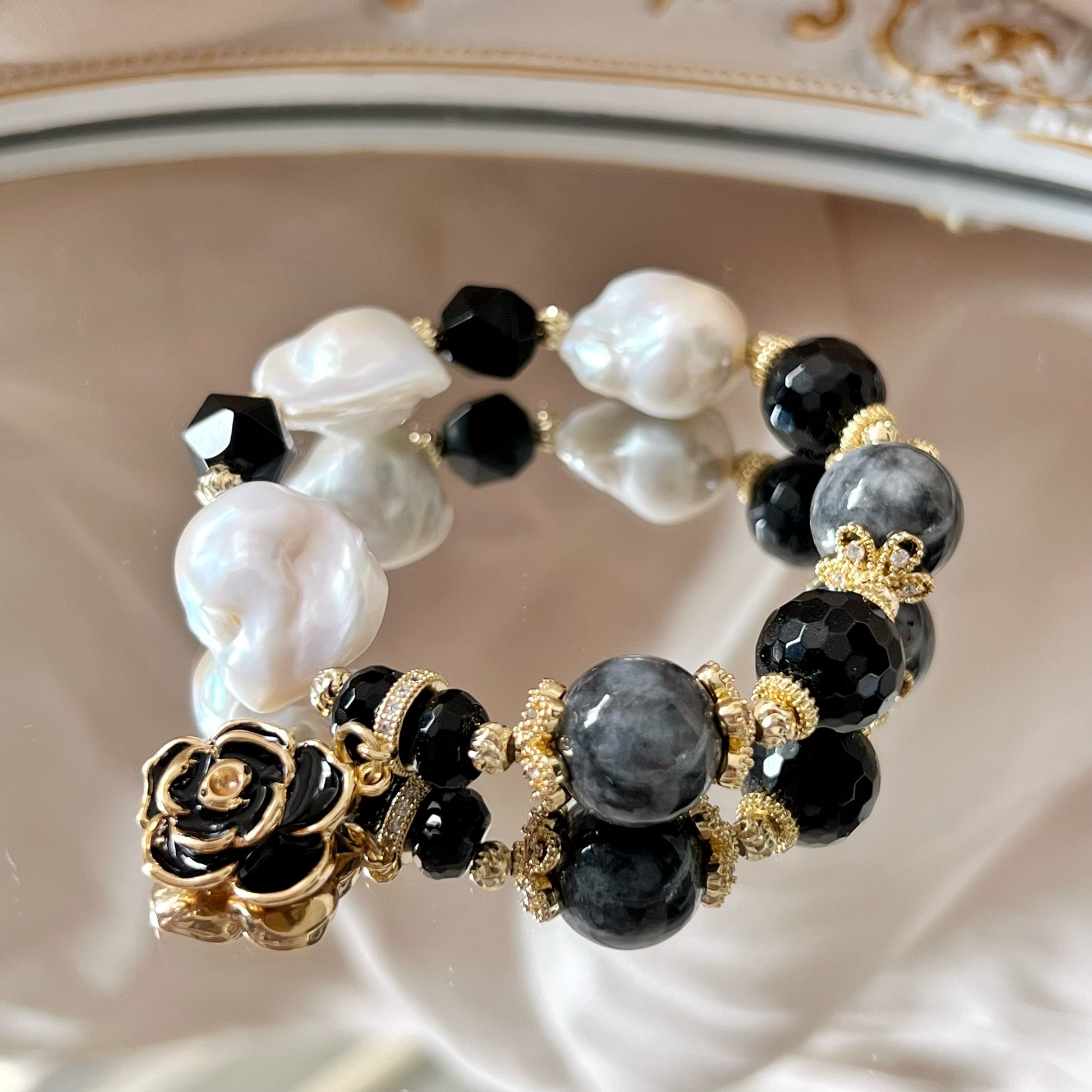 Couture Bracelet — Black Jade, Obsidian & Baroque Pearl