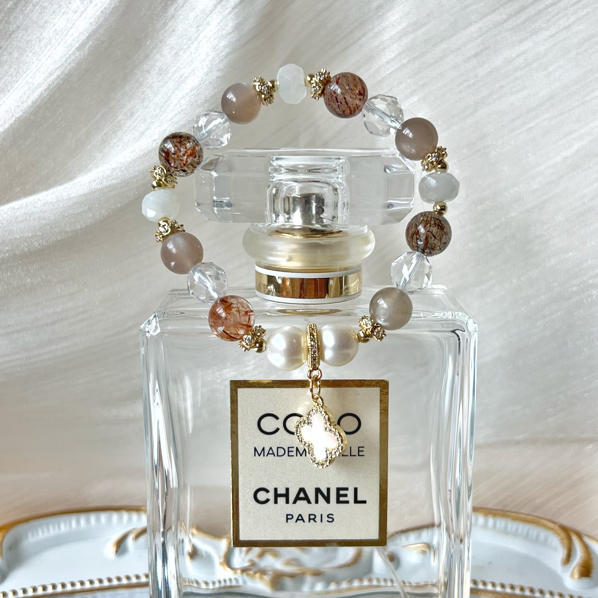 The Dawn bracelet evokes the fresh energy of a new day, blending Black Gold Rutilated Quartz, Clear Quartz, Champagne Moonstone, and Freshwater Pearl. Designed to bring clarity, calm, and positivity, this bracelet uplifts the spirit while balancing energy for a harmonious start to your day.