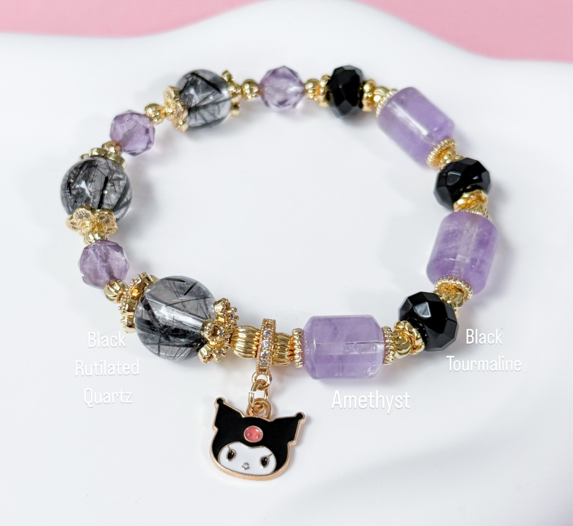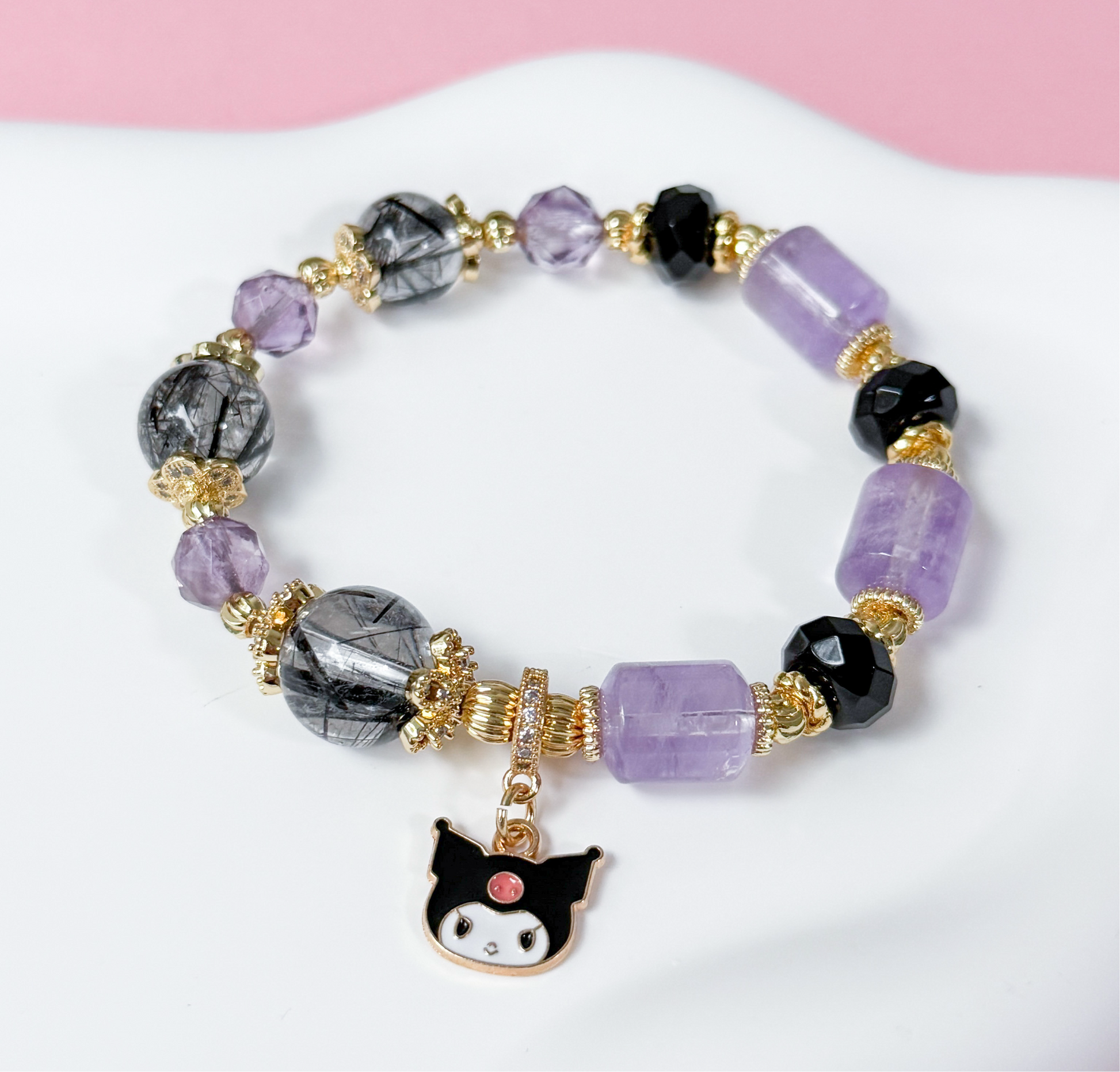 3. Amethyst 💜 – With calming and balancing qualities, Amethyst brings a sense of clarity and emotional balance. It adds a hint of elegance to the bracelet while representing Kuromi’s cool, enigmatic side.