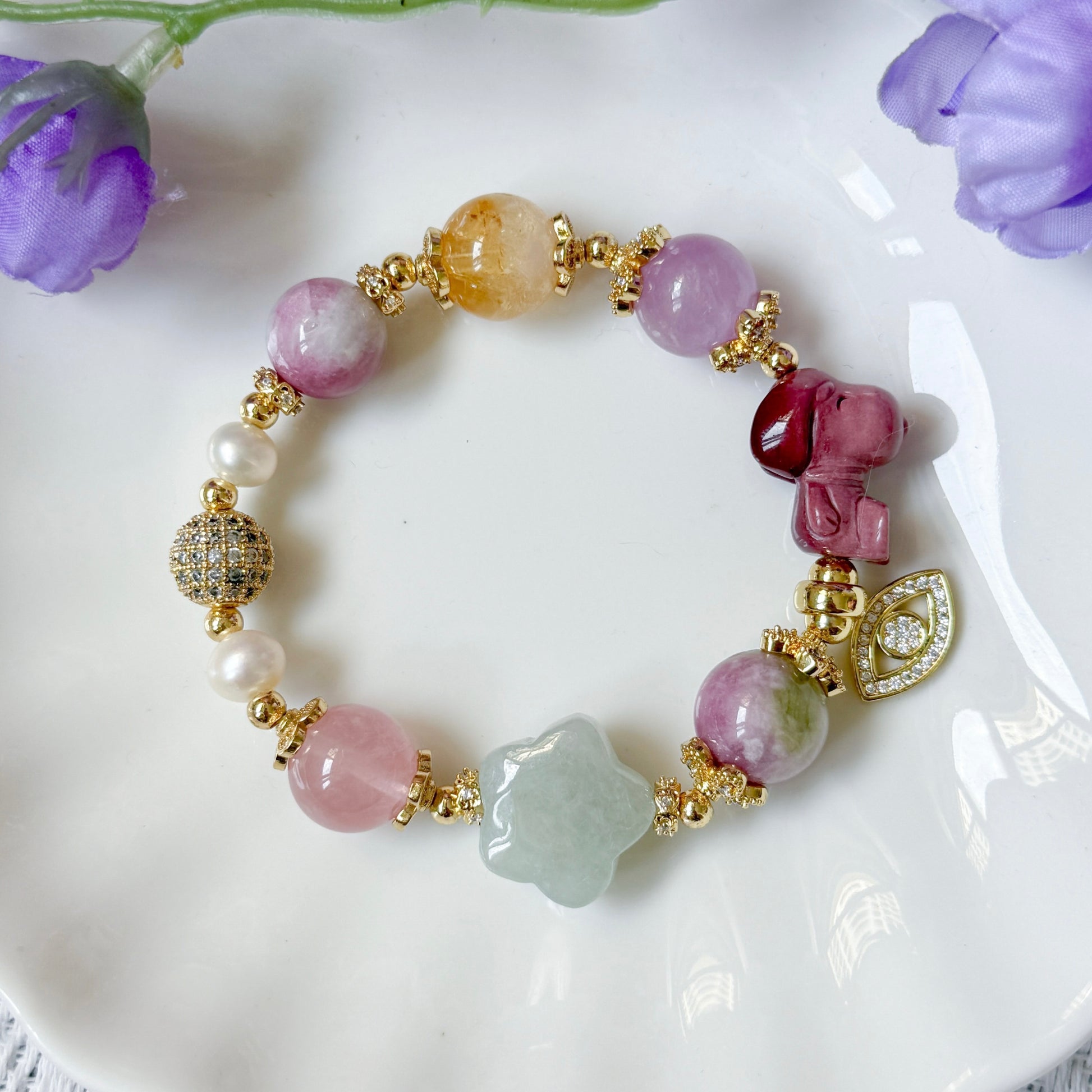 A bracelet thoughtfully crafted to harmonize serenity with abundance. This piece combines crystals that nurture the heart, ground the spirit, and invite prosperity into your life.