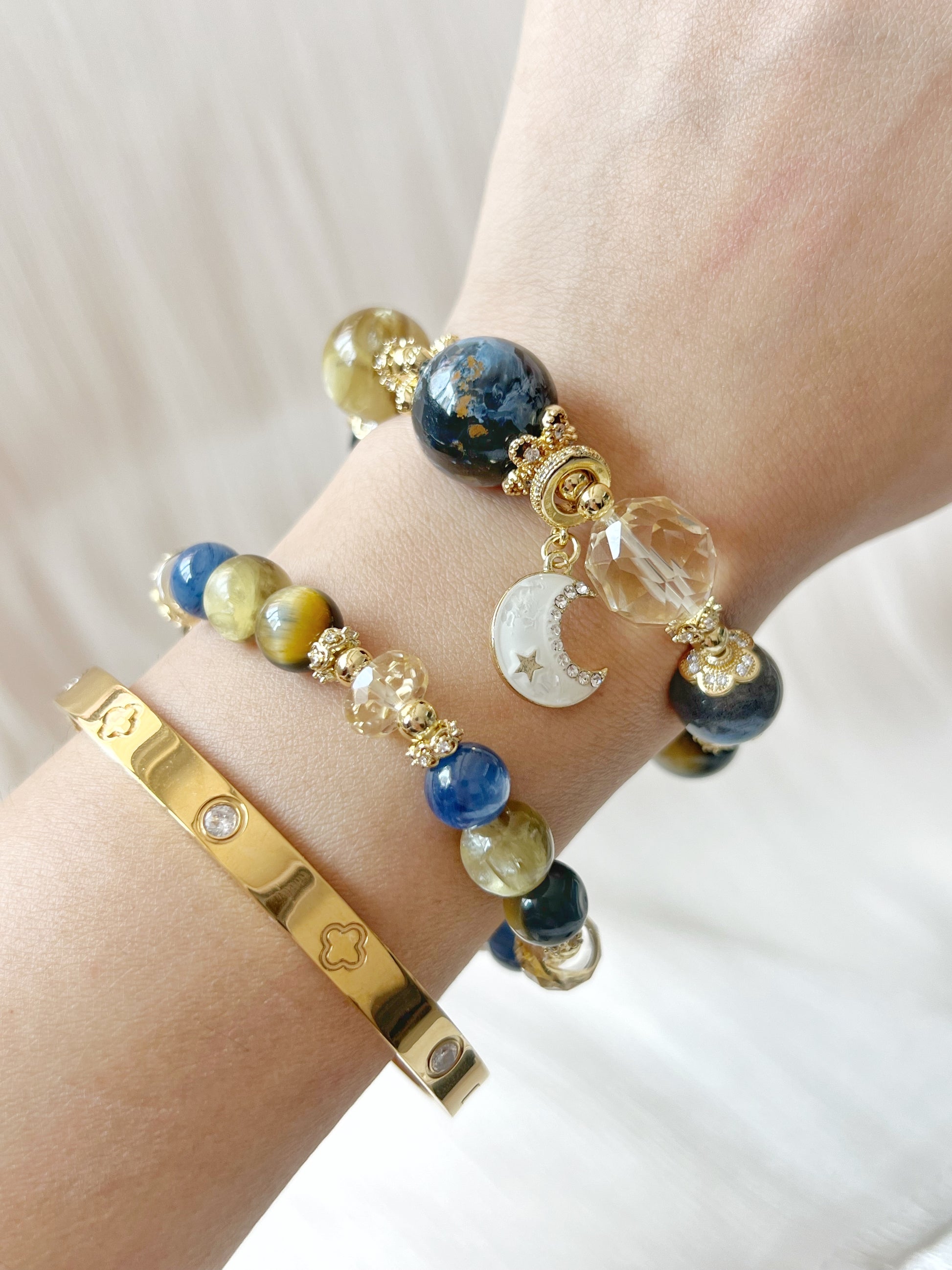 The Night Crystal Bracelet mirrors the beauty of the cosmos with Pietersite, Golden Mica, Citrine, Tiger Eye, and Kyanite. Like the night sky in motion, it holds energy of transformation, courage, and radiant guidance—reminding you that even in the quiet of night, the stars illuminate the path forward.