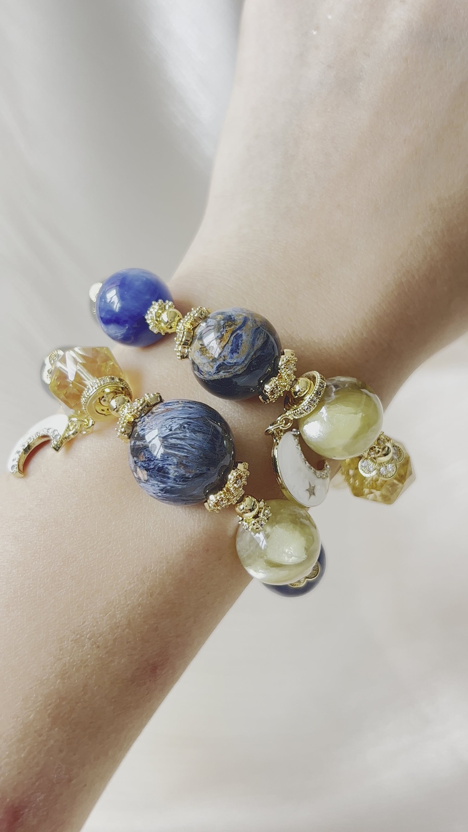 The Starry Crystal Bracelet is a celestial blend of Pietersite, Golden Mica, Citrine, Tiger Eye, and Kyanite—each crystal like a star guiding your journey. It embodies transformation, resilience, and radiant positivity, reminding you that even in darkness, the stars always shine.