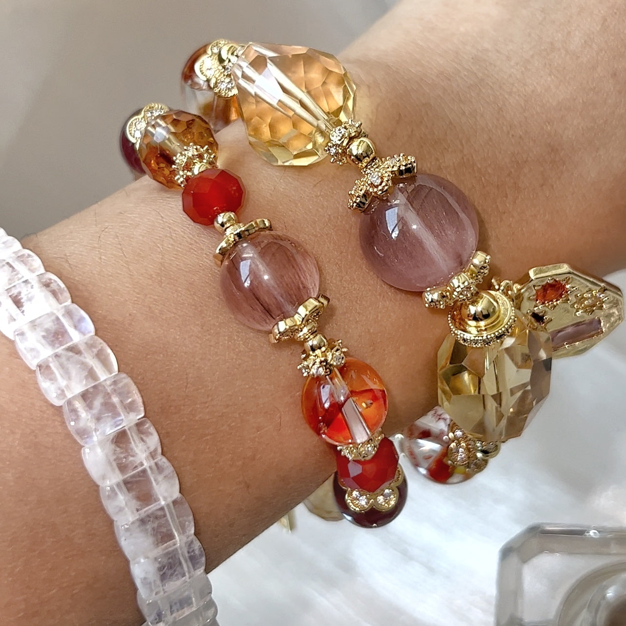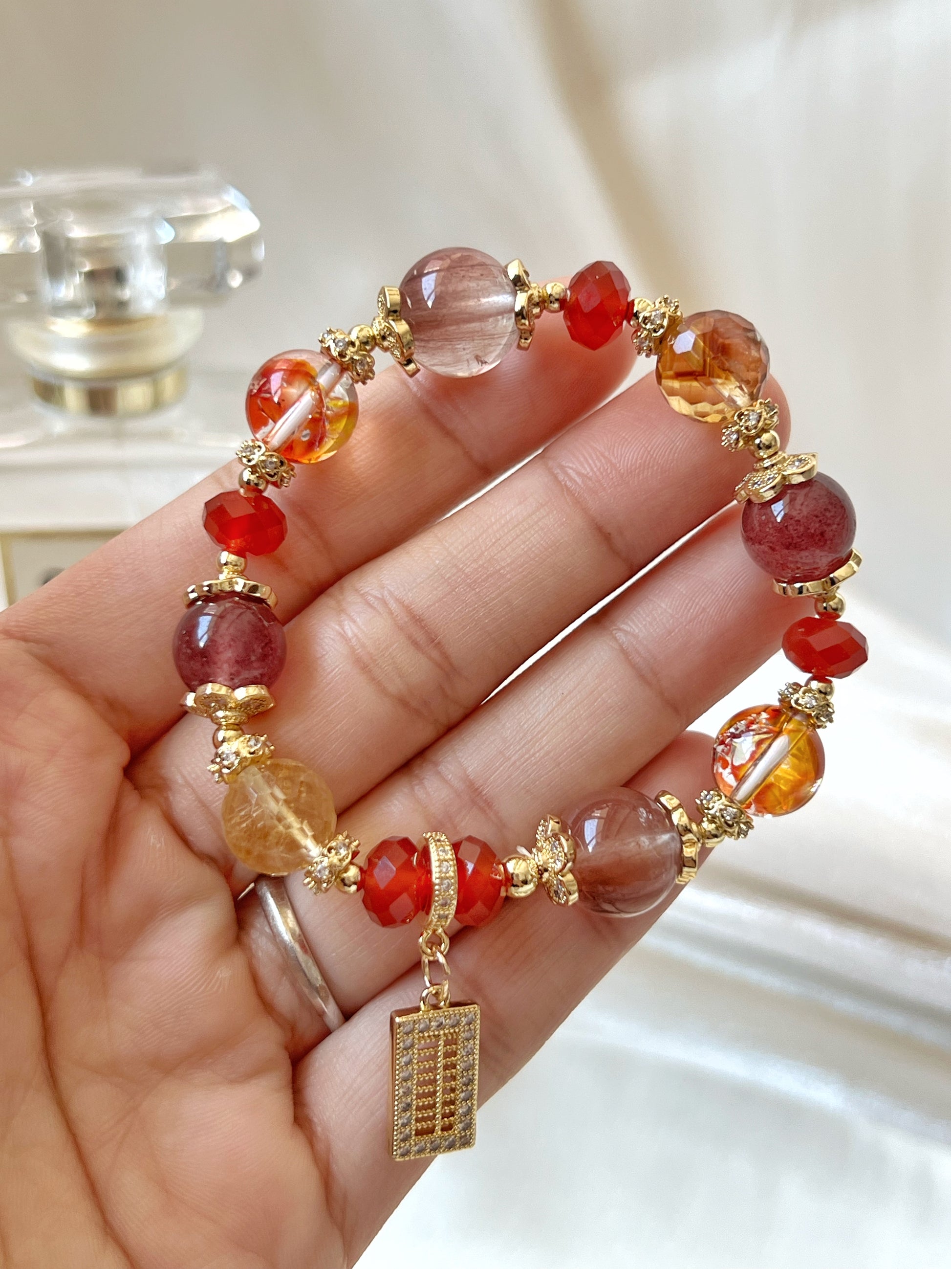Inspired by the iconic Singaporean delicacy, the Chilli Crab bracelet blends Burgundy Rabbit Hair Quartz, Red Agate, Red Hematoid, Citrine, and Strawberry Quartz. Its rich red tones embody courage, vitality, and joy, while also attracting positive energy and emotional balance.